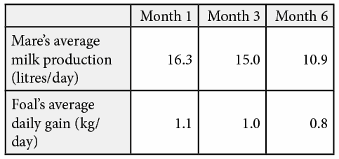 Table 1. Average milk production (litres/day) for a 500kg mare during months 1, 3 and 6 of lactation, and the average growth rate of a foal at months 1, 3, and 6 of age