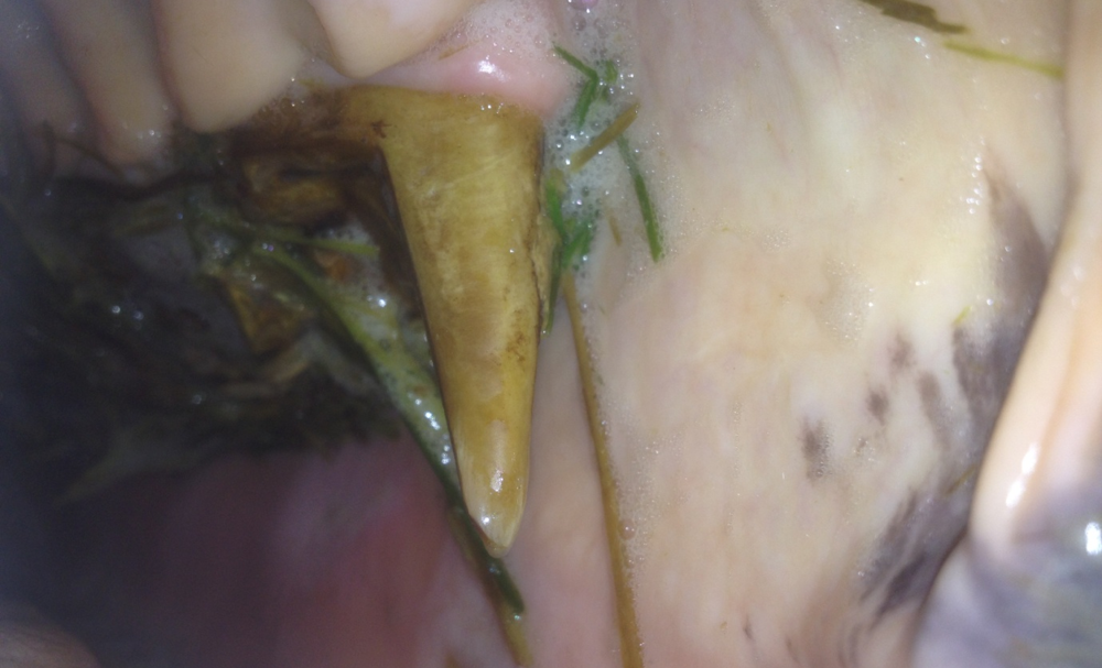 Figure 4. A large upper rostral hook, this was so large it was causing soft tissue trauma on the opposite lower jaw, preventing the horse from eating.